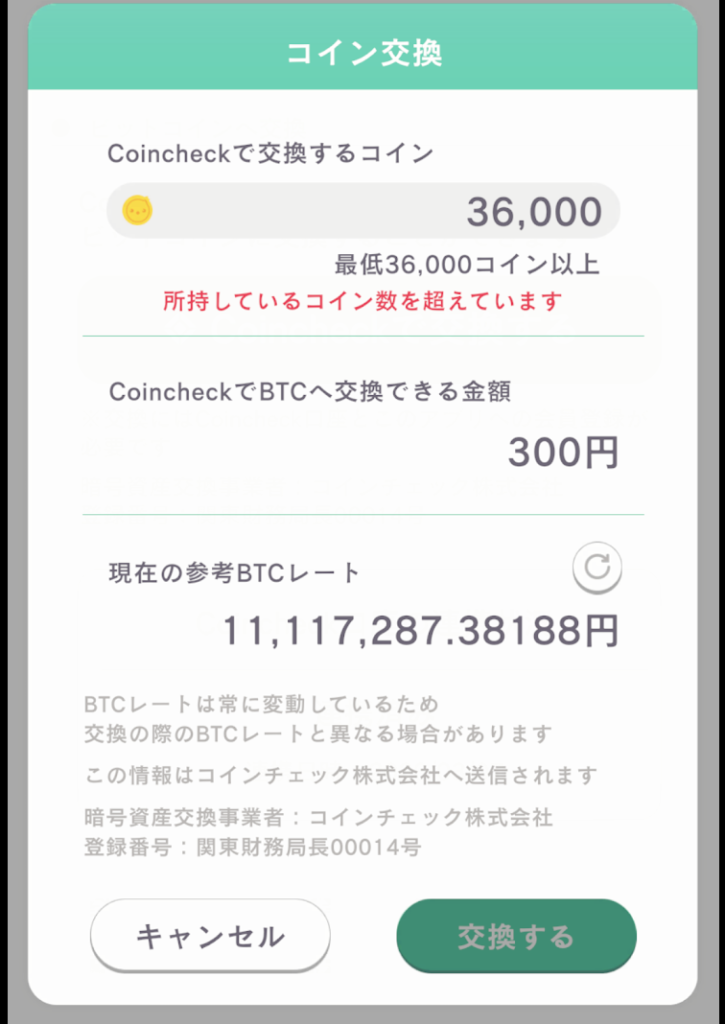 ただし、最低交換数量が36,000コインから、日本円にすると300円程度です。